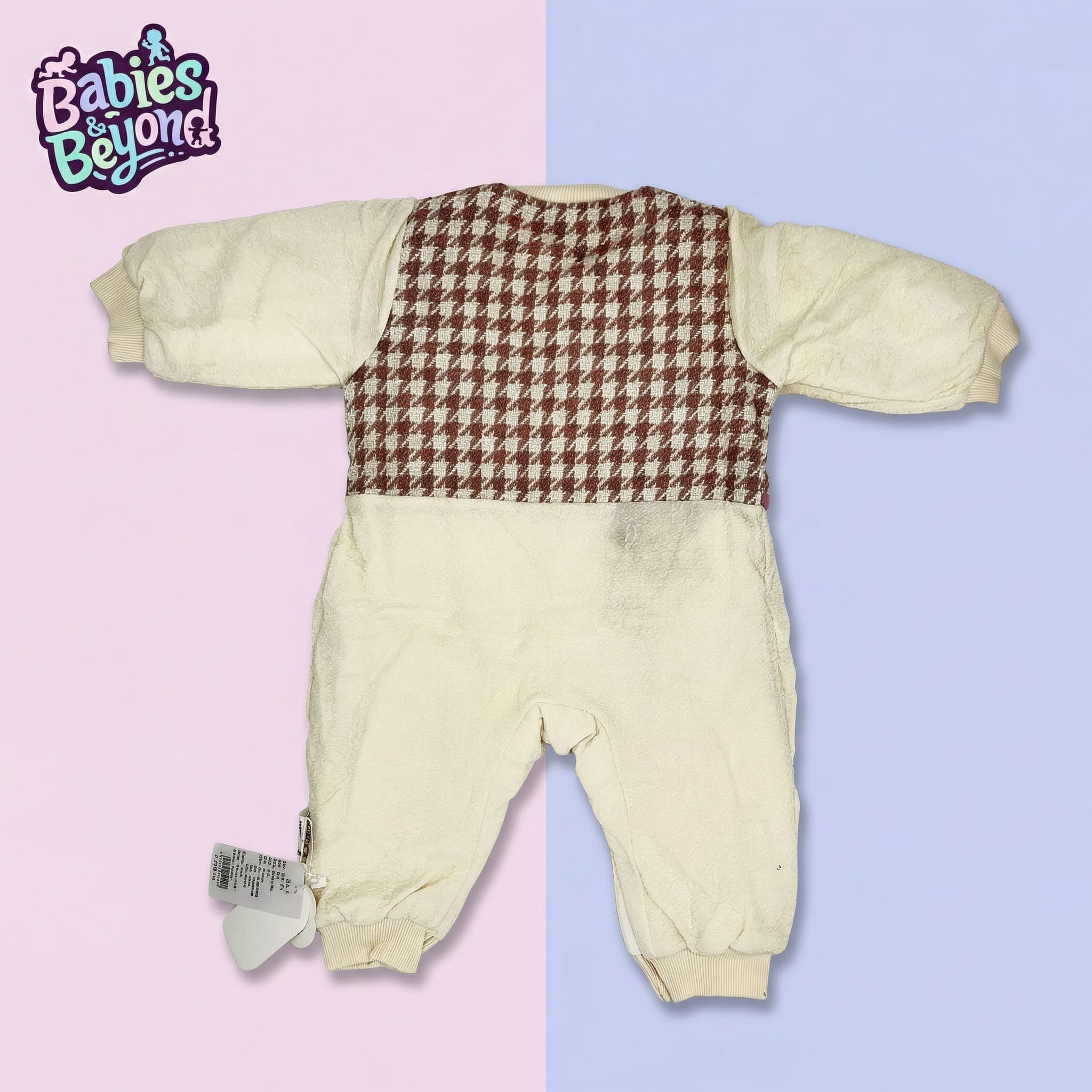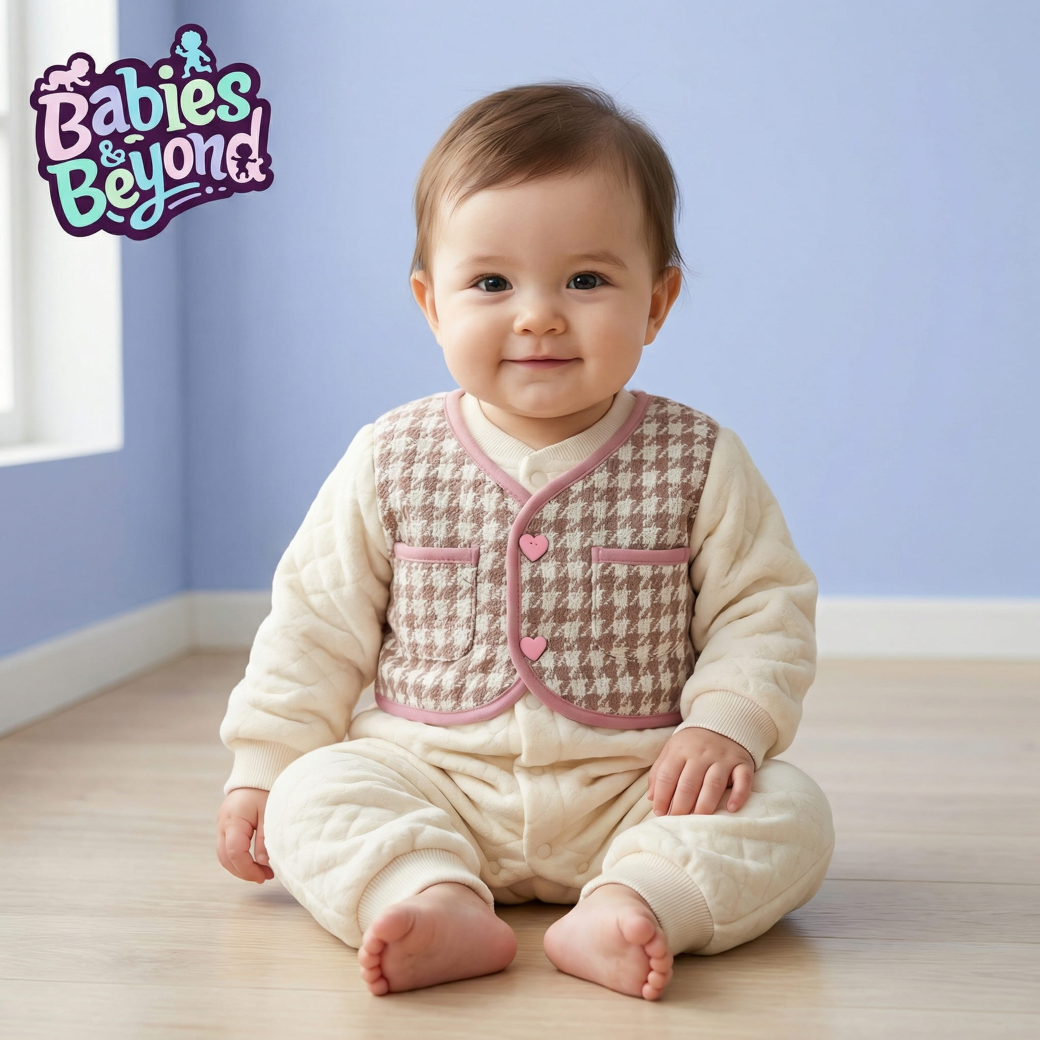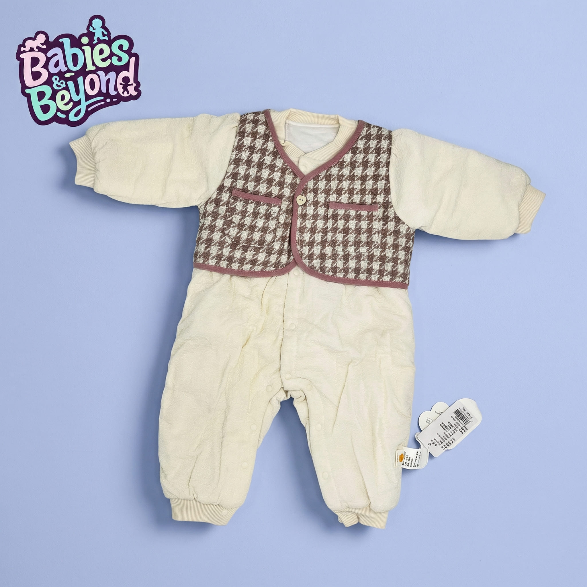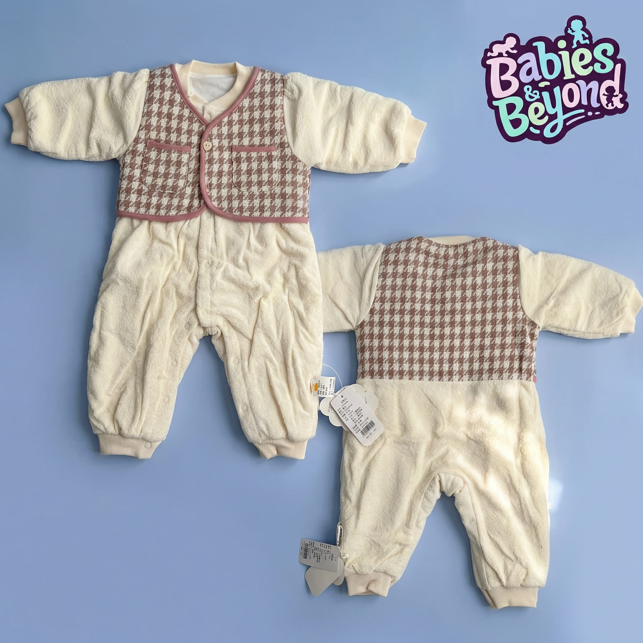 A cozy winter romper featuring a soft plush base and quilted vest design, crafted to keep babies warm, comfortable, and stylish during colder days.