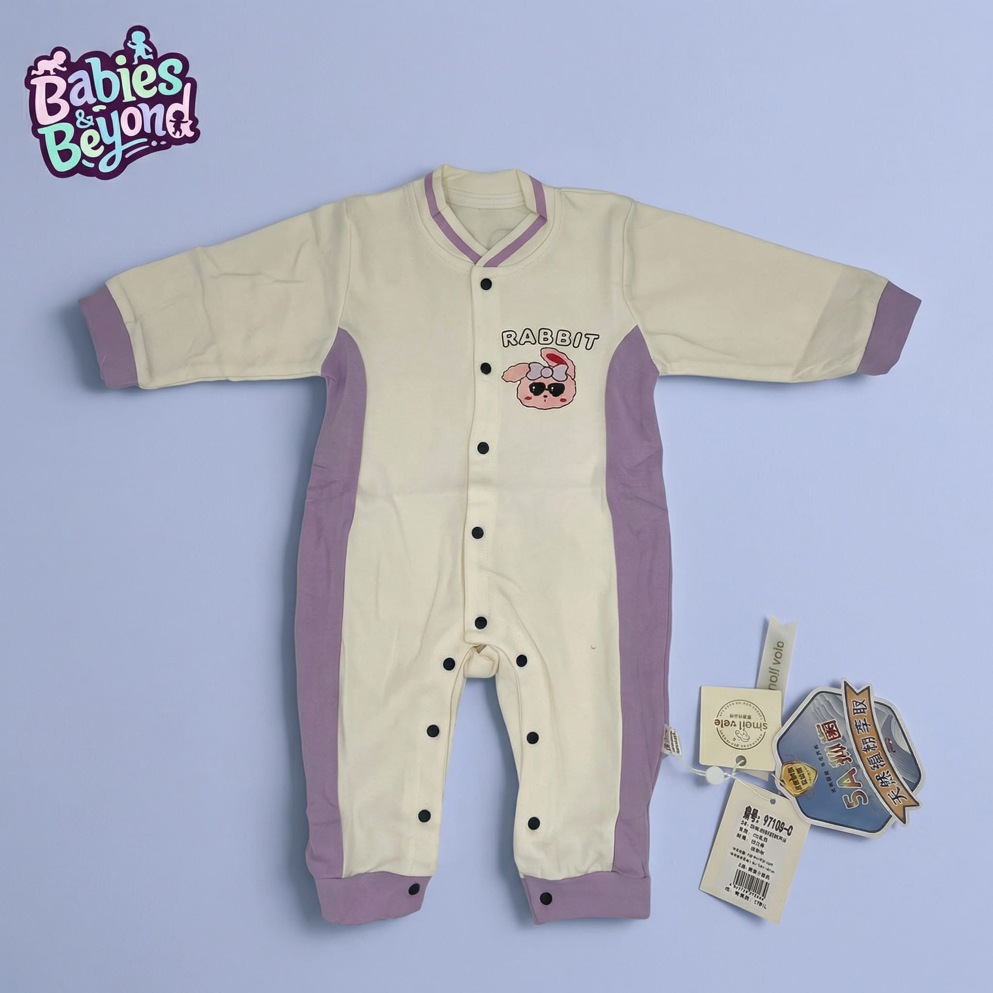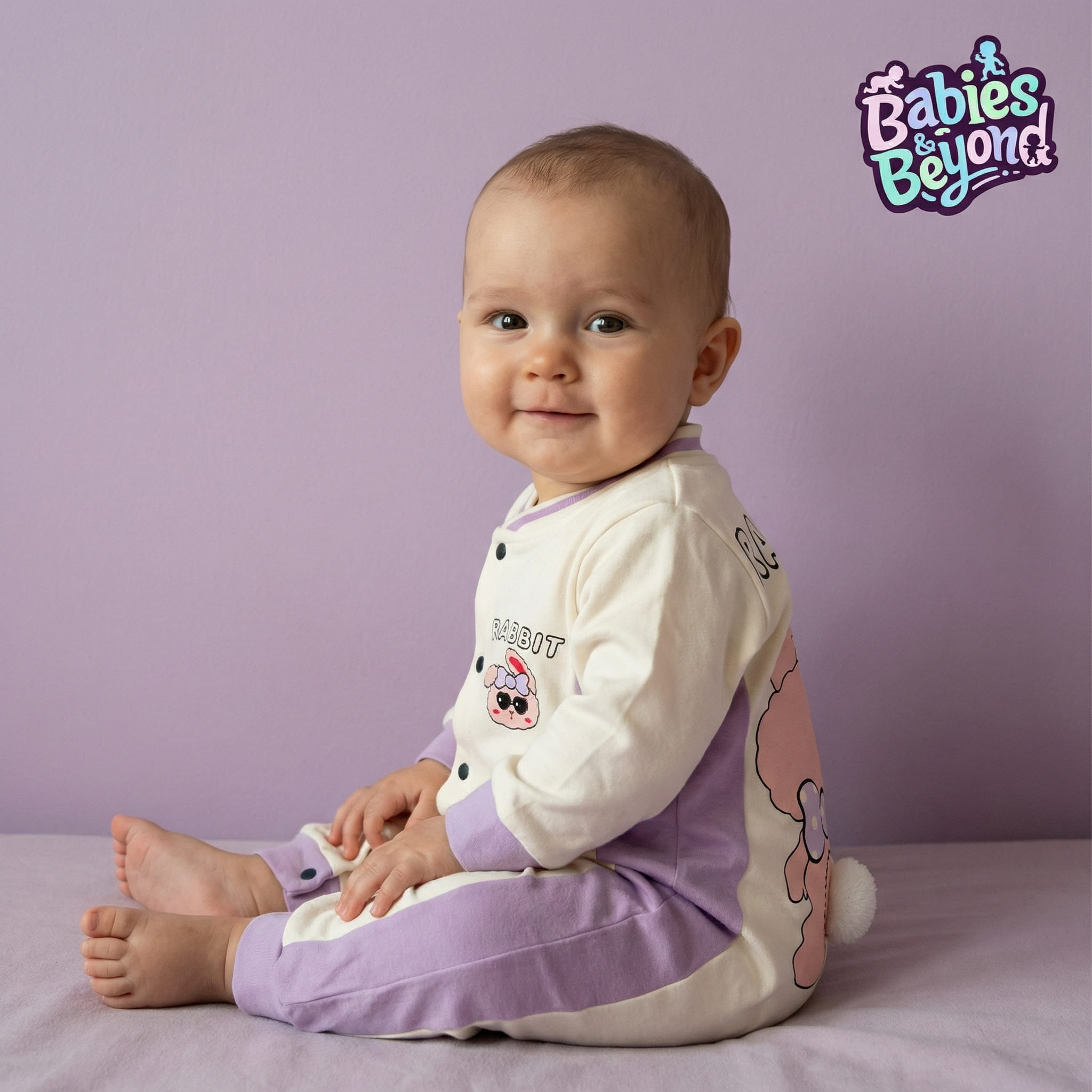 Introducing the Little Sprouts Summer Sparkle Rabbit Romper, a sweet and sporty essential for your baby’s summer wardrobe. This one-piece features a clean cream base with vibrant lavender purple side panels and matching ribbed cuffs. The chest is adorned with an adorable “RABBIT” graphic featuring a cool bunny wearing sunglasses, designed to bring a smile to every summer outing.